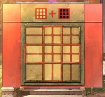 拿到日记本后,别急着离开。此时盒子处于盖上的状态,再次点击盒子,就能获取一张照片,照片呈现的是从未见过的场景。向左走,找到幽灵并把照片交给他,完成第一次对话后,再次与之对话,就会得知挂签架后面有条小路。进入神社,点击挂签架,就能找到妈妈,至此本章结束。 【第七关】剧情过后,向右走回到自己的卧室,查看书桌的柜子,最上面那个带密码的抽屉现在可以查看了。这个密码设定需要充分发挥我们的想象力。首先,上面所展示的既是顺序,也是方向。从左上角第一个方块开始,往下走,第二个方块出现,很明显这是一个2x2的布局。接着往右走,出现竖方块,再往上走,是横方块。每个方块的走法依据上面呈现的形状,所以整体点击方式如下图所示。