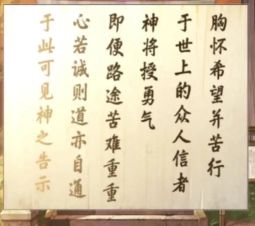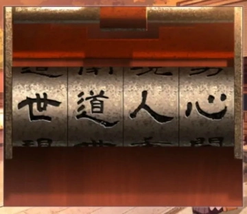 这个排列看起来有些眼熟,从谜题就能看出汉化组很用心了,出门到神社门口,查看右边的公告牌,看来位置是一样了,一条横线对应的字是世,两条横线对应道,三条横线对应人,四条横线对应心,所以我们获得了线索世道人心,回到神社内调整求签机。