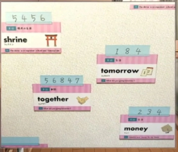 瞧一瞧右边桌子上方贴着的单词,图案一样,就是这个。首先第一个单词是“钱”,找到“钱”后开始分析,第二个字母是“o”,第三个是“n”,第四个是“e”,由此可知“钱”对应的英文是“one”,也就是数字1 。不得不说,日系解谜老是喜欢混入英语,虽说都是些简单英文单词,可解谜游戏都被文化入侵,着实有点令人悲哀。不过这跟米雪倒没什么关联~接着解第二个门的谜题,按照同样方法,对应的是“nine”,也就是9 。第三个“手”对应的是“three”,即3 。第四个“日历”对应的是“one”,也就是1 。所以得出密码是1931。