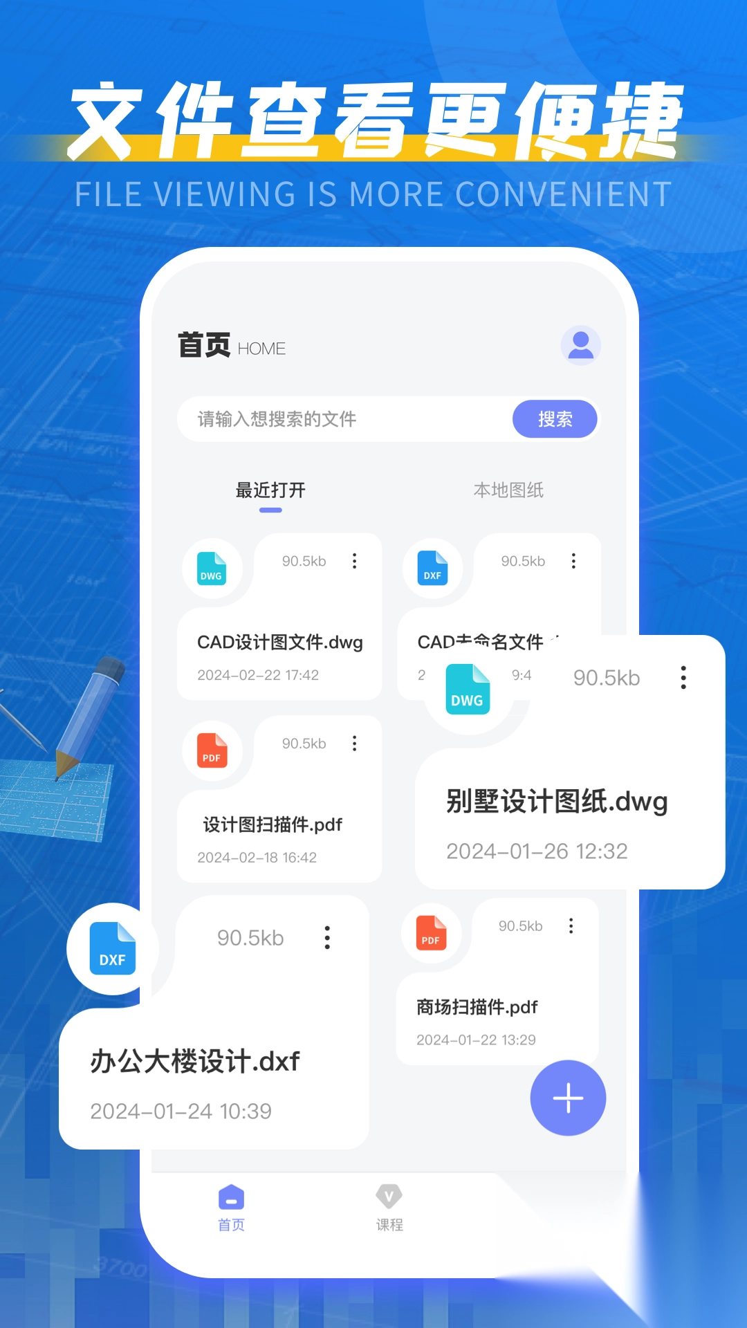1、功能方面较为朴素实在,首页主要具备查看图纸的功能。既能够直接打开本地图纸,也可以借助加号导入图纸。页面最上方设有搜索功能,凡是已打开的图纸内容均会自动保存。