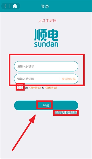 输入手机号,验证码,勾选同意 《用户协议》和《隐私协议》,点击登录即可,还可以点击使用账号密码登录