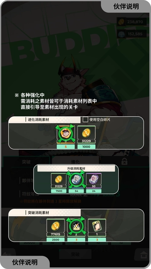升级:消耗经验果冻和金币可提升战斗数值,需要提高等级上限时则需要消耗突破素材。