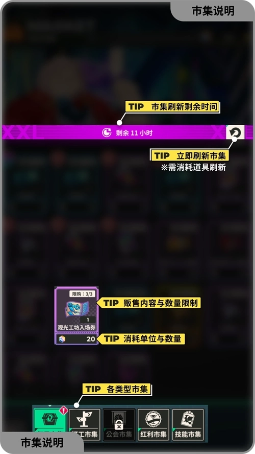 市集:可以使用虹石、好宝宝贴纸、公会点数、红利点数和心得兑换券等购买道具 & 素材。