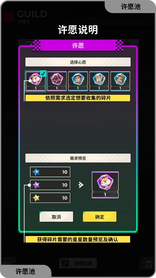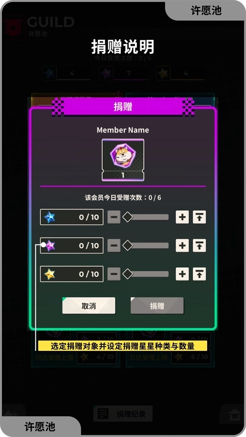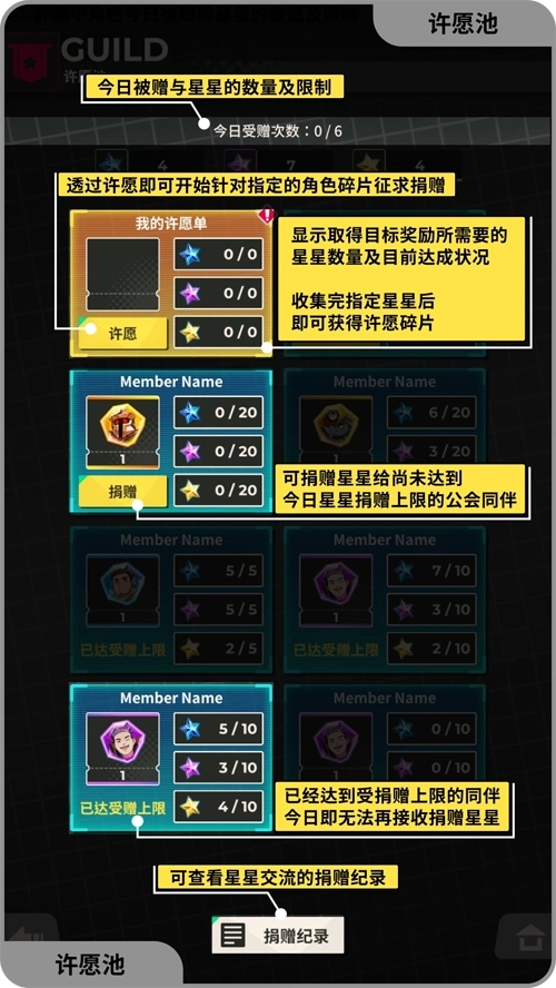 公会:可创建或加入其他玩家的公会,在许愿池页面可许愿想获得的角色,透过其他玩家的捐赠,获得指定的星星数,即可获得该角色。进行公会任务,可以获得公会点数,能够在公会市集购买各角色脱光衣服的模样。