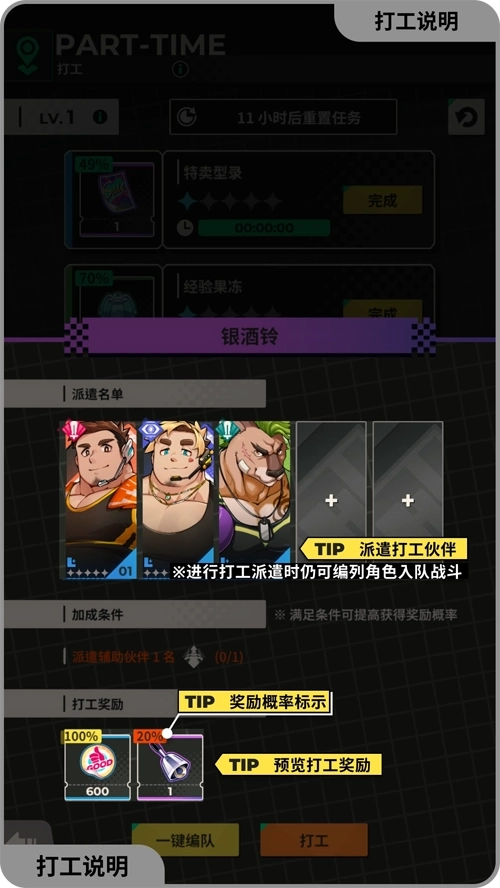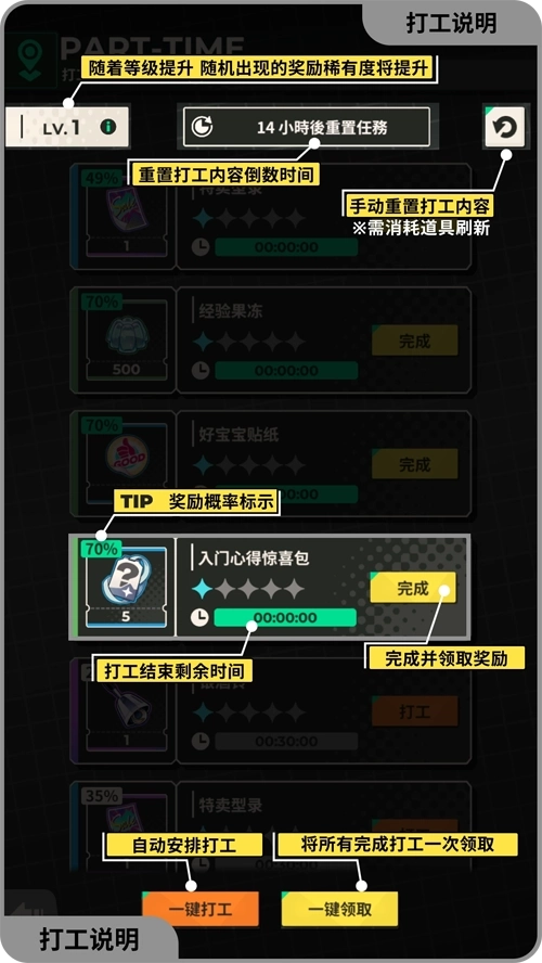 打工:派遣伙伴打工,可获得好宝宝贴纸,并有概率获得其他奖励。