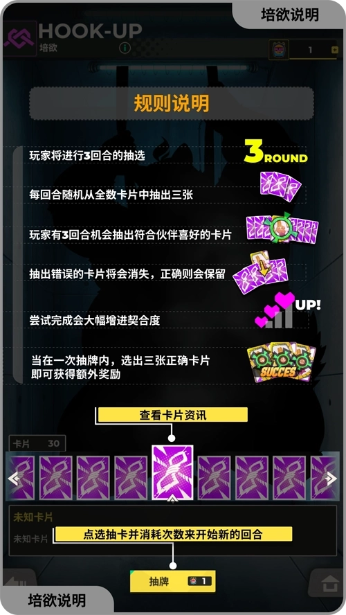 每天有 1 次免费的培欲小游戏次数,1 次培欲将进行 3 回合的卡片抽选