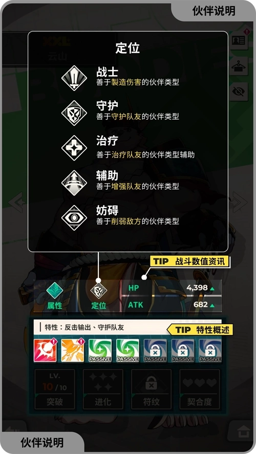 可以在伙伴页面进行鉴赏和提升角色能力。目前伙伴的定位共有五种,