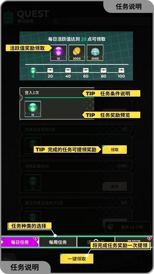 任务:完成任务并累积活跃值可以获得奖励。