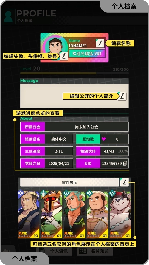A:请在游戏主画面点击左上方的伙伴头像,点选【笔】图案即可对游戏名字、头像/头像框/称号、自我介绍和伙伴展示进行修改。