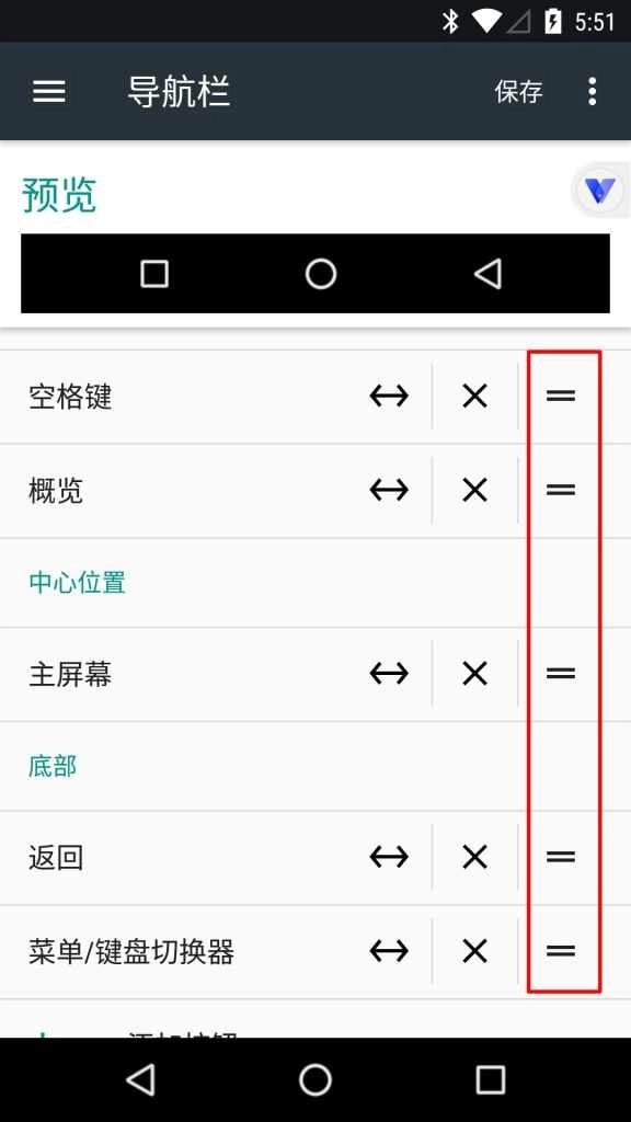 3.点击导航栏进入设置界面,长按右侧=号上下拖动个按钮位置,如下图位置所示为主流返回在右键布局。(注意六个位置顺序必须如下图所示)点击保存即可。