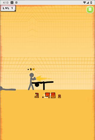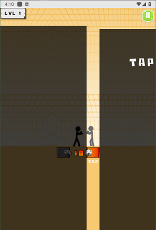 2在每一个关卡中,你要控制深色火柴人去攻击对手火柴人。一旦对手进入可攻击的区域,就得立刻点击拳头图标来发动攻击。