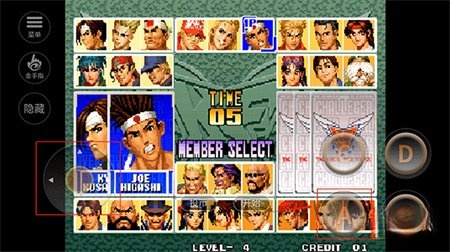 5、游戏启动后,进入角色选择阶段,通过屏幕左下角的摇杆按钮来切换角色,按A键确认所选角色,一共要挑选三位角色。