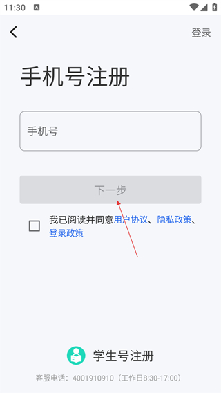 3、进入手机号注册页面后,输入手机号并勾选同意相关协议,接着点击【下一步】按钮,即可进入设置密码的页面。