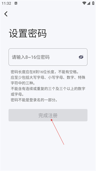 4、在设置密码页面,输入符合要求的密码后,点击【完成注册】按钮完成账号注册操作。