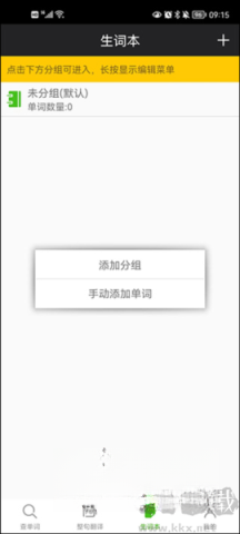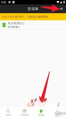 5、想要记忆生词?点击“生词本”进入单词管理界面,利用右上角“+”按钮创建新分组,添加那些你需要重点记忆的单词,一起战斗吧!