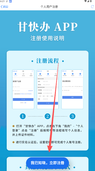 2、查看图示注册流程说明,完整浏览过后,点击我已知晓,立即注册。