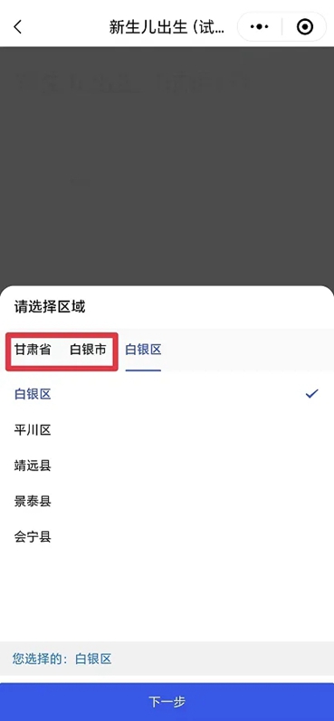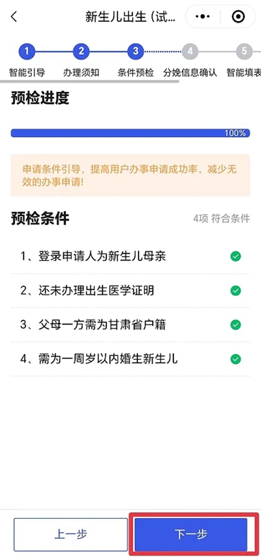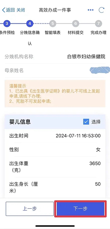 9、根据提示,录入相关内容(包括:新生儿信息、母亲信息、父亲信息、领证人信息、户籍信息和医保信息)(注:父母亲户籍地址及居住地址都填写为新生儿父母有效身份证件地址,并认真核对填写是否完整),点击下一步。