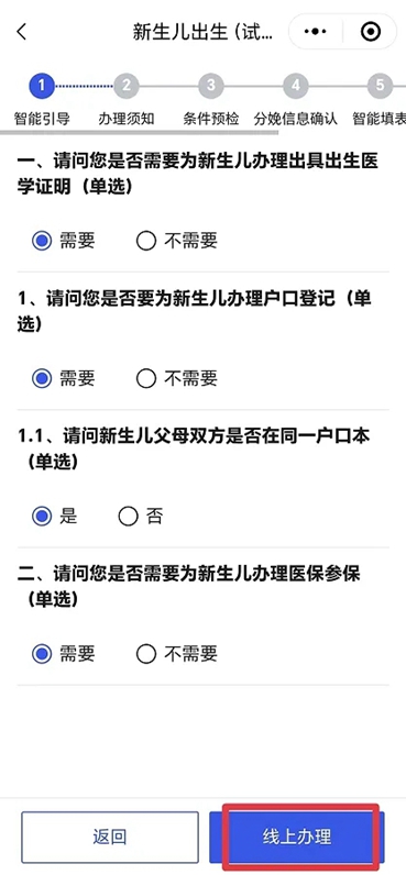 5、根据提示,对以下问题做出勾选,点击线上办理。