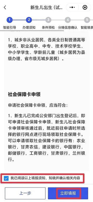6、阅读办理须知,选择“我已阅读以上填报须知,知晓并确认相关内容,”点击立即填报。