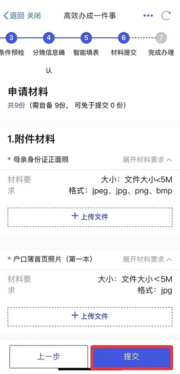 10、根据提示,上传相关照片。包括:父母亲身份证正反面照片、户口簿首页照片(如果父母双方不在同一个户口本上,则2个户口簿首页照片都需拍照)、户口簿父母亲页照片和结婚证照片,点击提交。